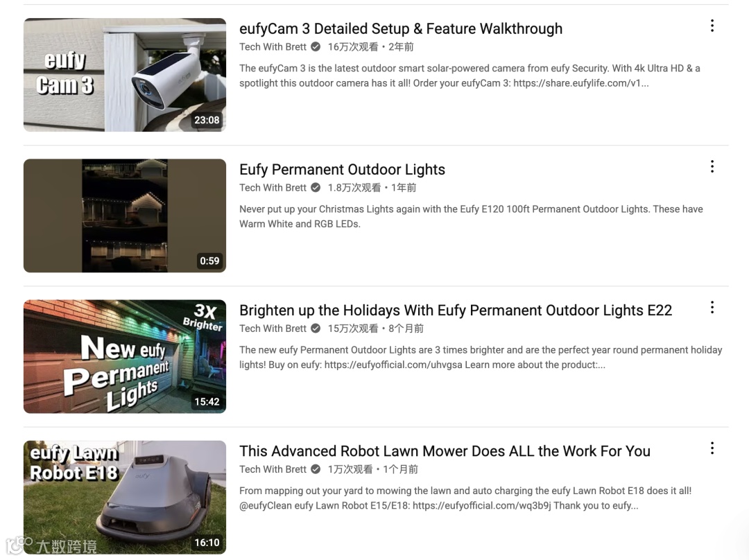 尽管目前Eufy仍主要依赖亚马逊等第三方平台进行销售,独立站的占比尚小,但通过与海外优质科技类KOL的合作,Eufy正在稳步提升品牌在目标市场的认知度与影响力。在这条出海路径上,YouTube科技频道Tech With Brett成为其推广过程中的重要助力者之一。