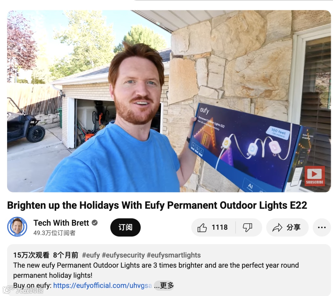 在过去两年里,Tech With Brett与eufy合作推出了4支广告视频,总播放量超过34万次,整体数据表现优异。其中最具代表性的作品是关于Eufy第二代户外永久灯具E22的评测视频《Brighten up the Holidays With Eufy Permanent Outdoor Lights E22》,该视频单条播放量达到15万次,收获了超过1100个点赞,充分展现了观众对内容的认可与产品的兴趣。