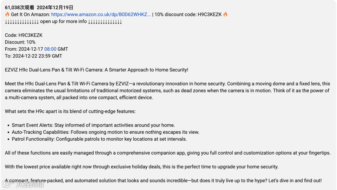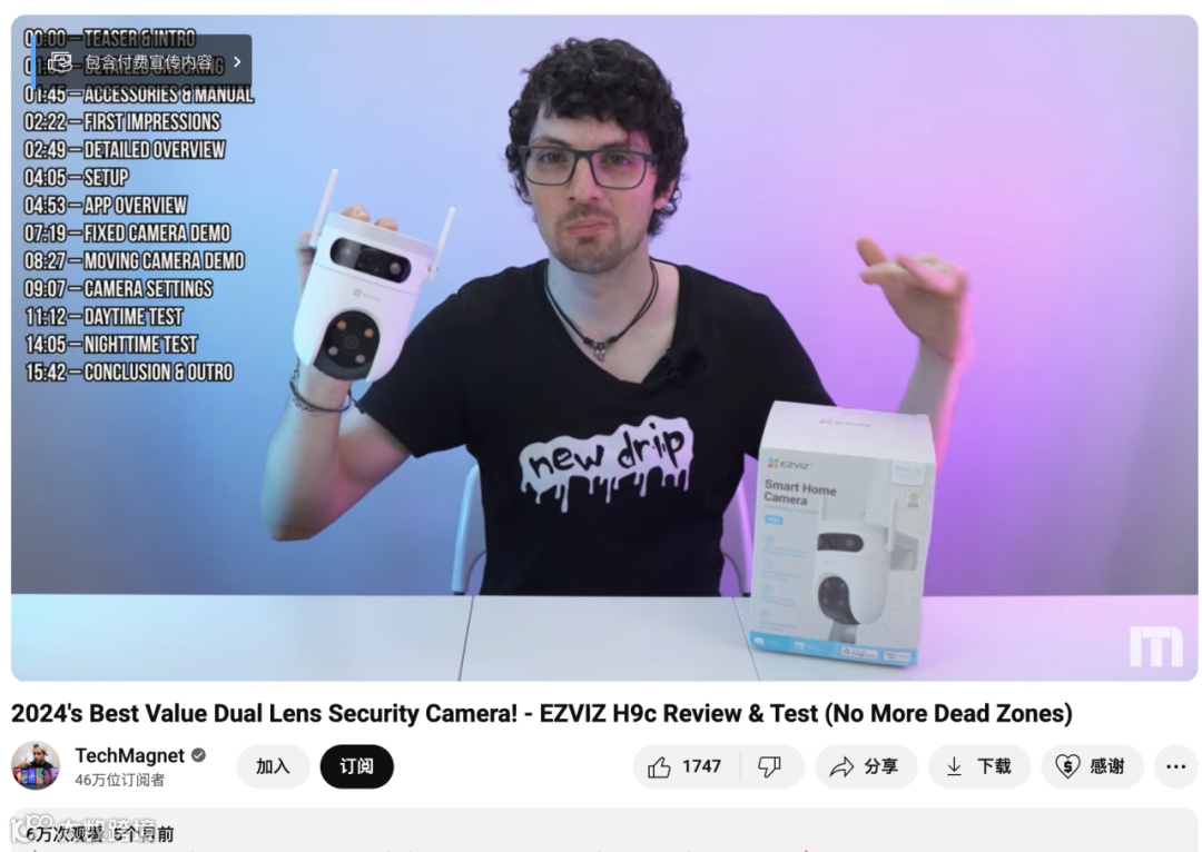 此外,TechMagne所面向的受众群体广泛,涵盖了从科技发烧友到普通家庭用户的多个层次,这使得Ezviz的品牌信息得以触达更多元化的潜在客户。为了提升转化效率,他还在视频描述中嵌入了购买链接,引导观众完成从观看内容到实际购买的行为闭环。同时,他也鼓励观众点赞、订阅并开启通知提醒,进一步提升了频道的影响力和品牌曝光的频率。