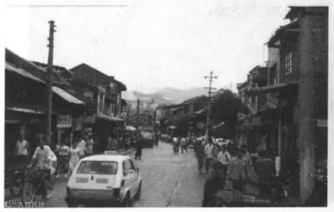 1980 年代都司路:道路上车辆行人往来,两旁为老式民居与商店,远处山峦可见,展现当时的城市街景面貌。