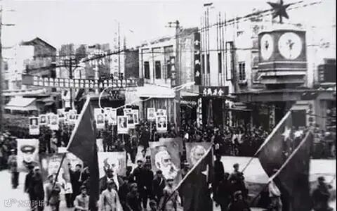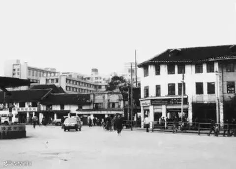 1954 年的大十字:街道人流密集,两旁商铺林立,空中悬挂旗帜,展现出建国初期城市中心的繁荣景象。