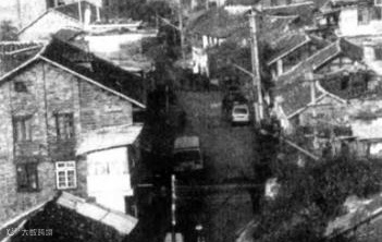 箭道街旧貌:从高处俯视,街道两侧多为低矮房屋,车辆与行人穿行其间,反映了过去的城市居住与交通状况。