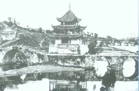 解放前的甲秀楼:甲秀楼矗立水边,建筑风格古朴典雅,周围环境原始自然,与今日景观形成鲜明对比。