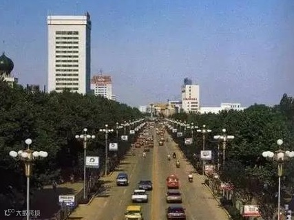1990 年代的马路街:呈现1990年代邢台马路街场景,街道有车辆和行人,两侧为低矮商铺,生活气息浓厚。