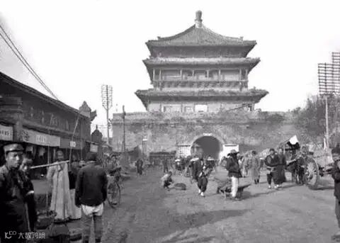 1914 年西安钟楼:拍摄于1914年,钟楼居画面中央,飞檐斗拱,气势恢宏,为中国传统建筑典范;周边低矮建筑林立,街道上有马车和行人,展现了当时城市中心的繁华景象。