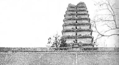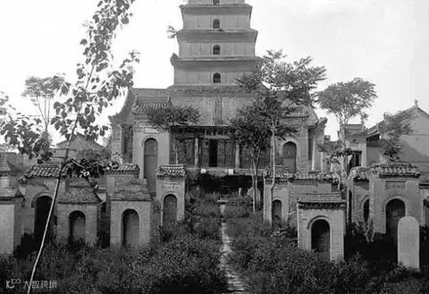 1921 年西安小雁塔:瑞典汉学家奥斯瓦尔德・喜仁龙于1921年拍摄,小雁塔呈锥形,造型典雅,塔前数人着传统服饰,周围古建与树木相映,画面宁静,凸显其悠久历史与文化价值。