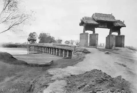 1910 年西安府西 40 里处古桥:由《泰晤士报》记者莫理循于1910年拍摄,位于咸阳附近,桥梁结构简朴,横跨河流,四周为开阔田野,远处树木与建筑点缀其间,呈现出典型的田园风光。