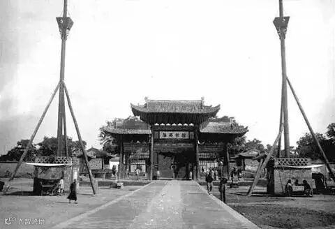 1907 年 西安藩台衙门:拍摄于1907年,可见藩台衙门大门及两根高旗杆,建筑庄重威严,体现清代官府气派,周围有人活动,反映了当时的行政建筑特色与社会场景。