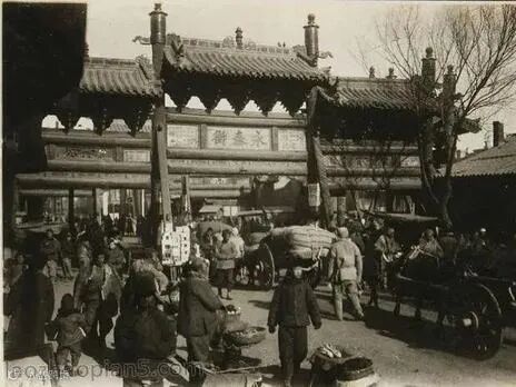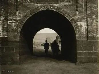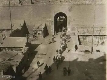 1937年大同古城的城门:画面中城门上方建有城楼,下方行人、马车往来穿梭,生动再现了当时古城交通与日常生活的场景。