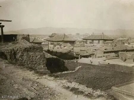 1937年大同城墙上观城内:从城墙俯瞰,可见大量传统中式建筑,屋顶错落有序,街道布局清晰,呈现出民国时期大同城内的典型景象。
