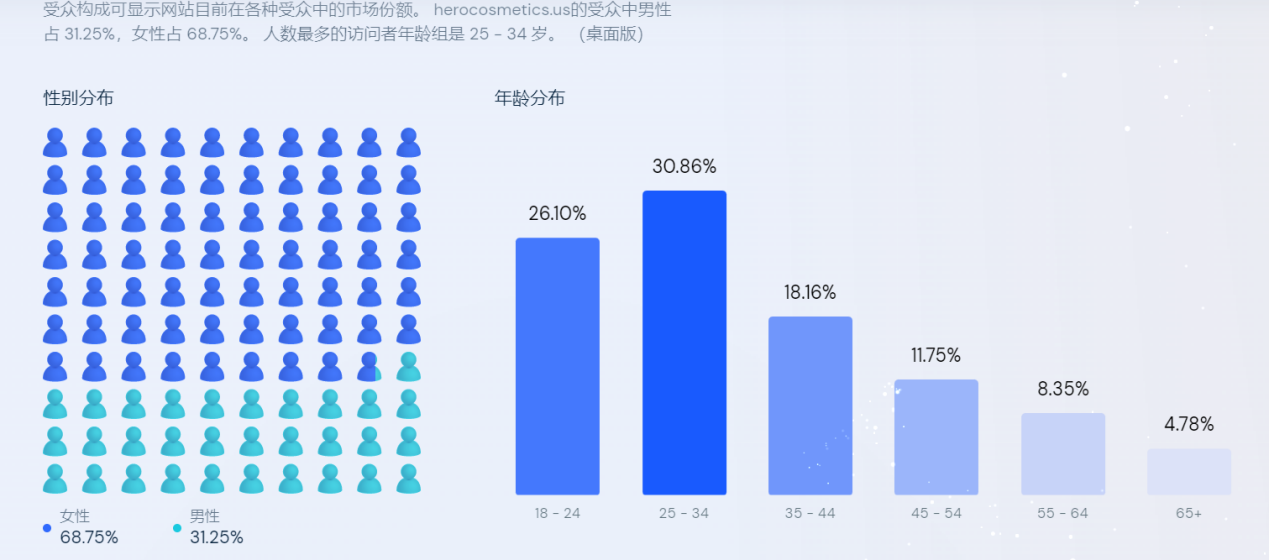 不满足于一直给亚马逊“打工”,Hero Cosmetics创立了自己的DTC网站“herocosmetics.us”。Similarweb数据显示,在刚刚过去的6月,该网站斩获了465.3K的总访问量,在美国的美容化妆品品类中排名247。访问网站的人中女性占比68.75%,男性占比31.25%,访问人数最多的年龄组是25-34岁。