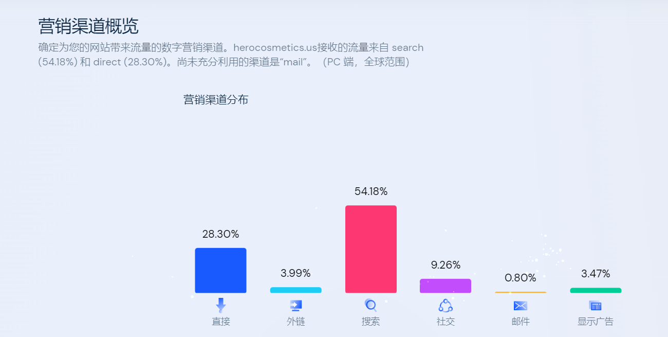 在所有数字营销渠道中,herocosmetics.us在电脑端上接收到的流量主要来自搜索(54.18%)和直接点击(28.30%),热门关键词有hero cosmetics(15.18%)、mighty patch(3.42%)、hero cosmetics sale(2.08%)、fungal acne(1.64%)、hero pimple patches(1.29%)……