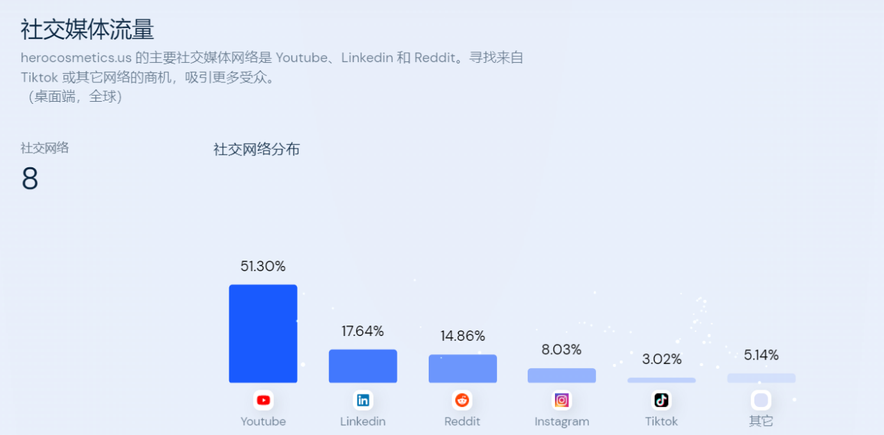 除了Google搜索广告,Hero Cosmetics对社交媒体也十分重视,Hero Cosmetics的社媒渠道包含了Instagram、TikTok、Facebook、Twitter和YouTube。就引流效果而言,YouTube占据大头,LinkedIn和Reddit紧随其后。Instagram和Tik Tok也有非常不错的数据:Hero Cosmetics合计粉丝21万,其中Instagram和TikTok各10万粉丝,占据了绝大比重,而在测试中,Tik Tok的转化率超过了Instagram。