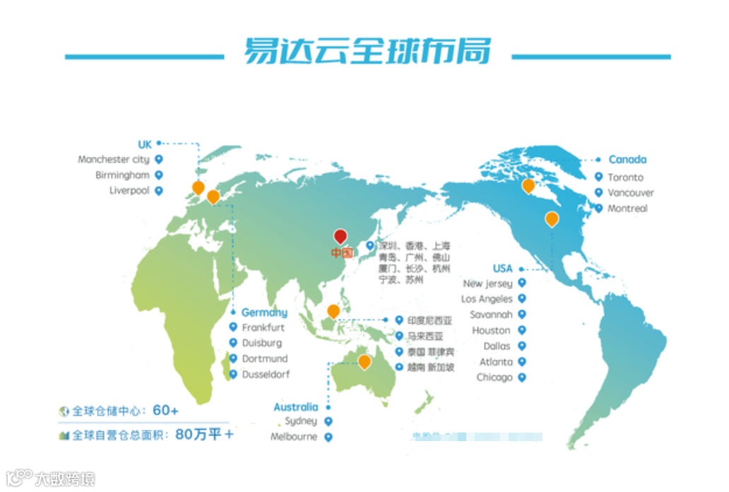 EDA集团控股(简称 易达云)是新时代领先的全球人工智能物流技术服务集团,也是中国海外仓上市第一股 02505.HK,在美西、美中、美南、美东均有布局,美国海外仓总面积超600,000m²,仓群所在州及周边1-2个工作日交付,邻近州2-3个工作日交付,美国本土绝大部分州3-5个工作日交付。
