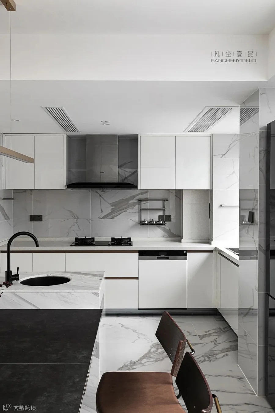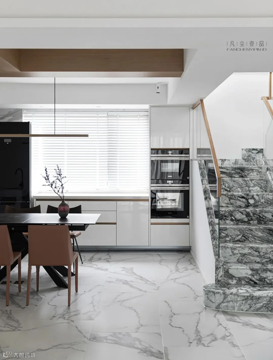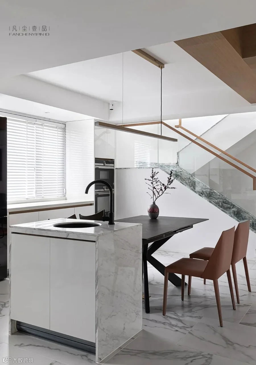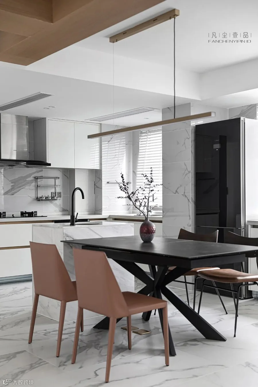 厨房的壁柜与台面均采用鱼肚白大理石,纯净的白色搭配优雅纹理,使空间显得整洁有序。餐厅与厨房通过鱼肚白材质进行视觉分隔,辅以绿植点缀,营造出富有层次感的生活氛围。