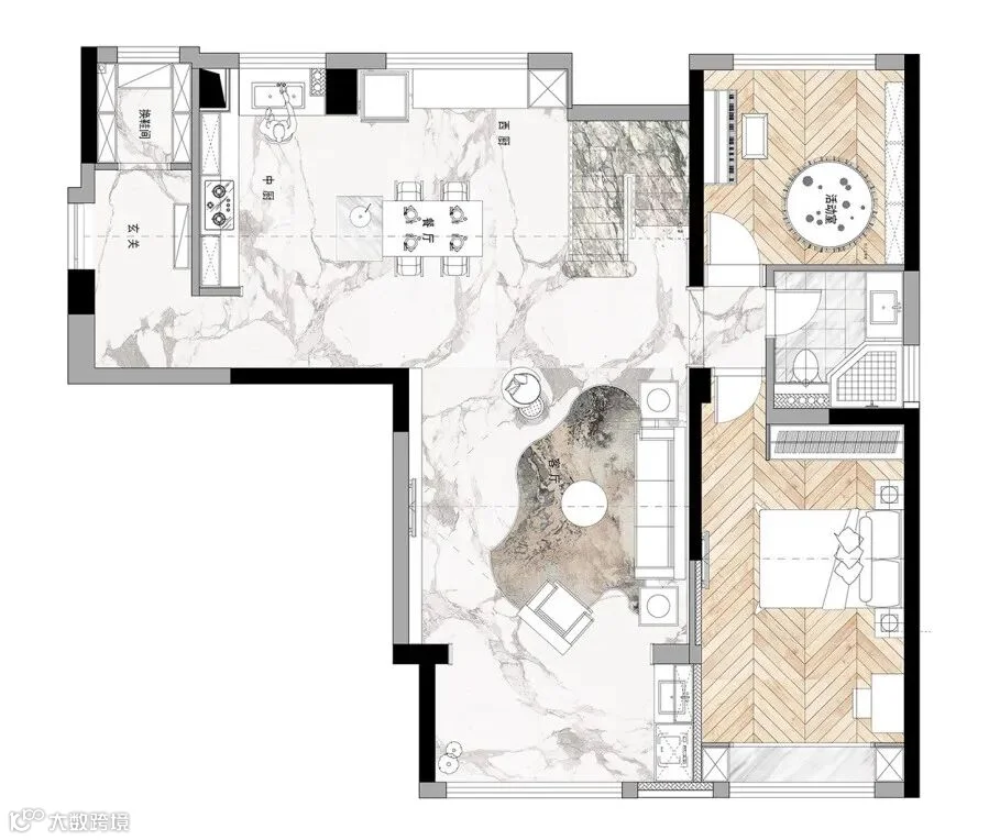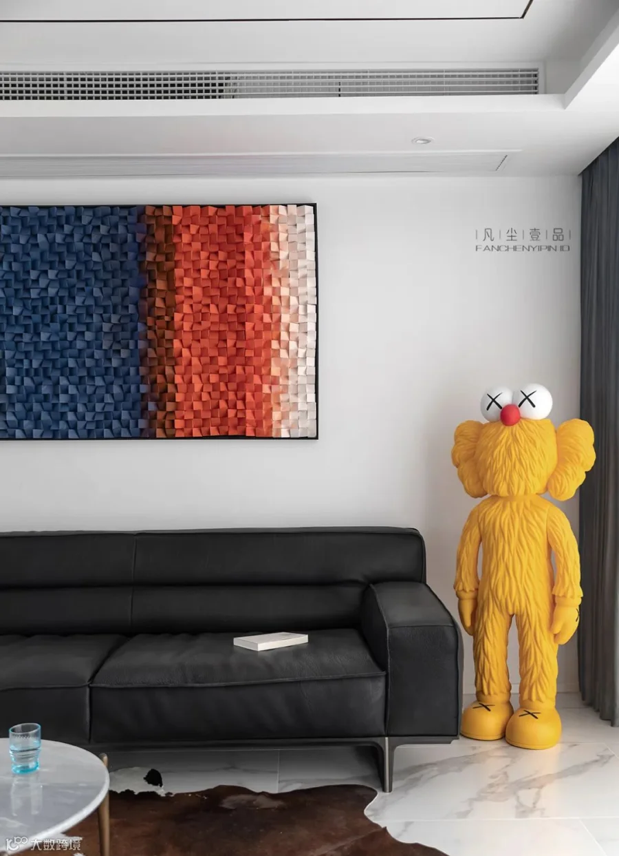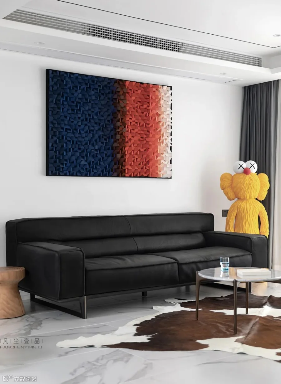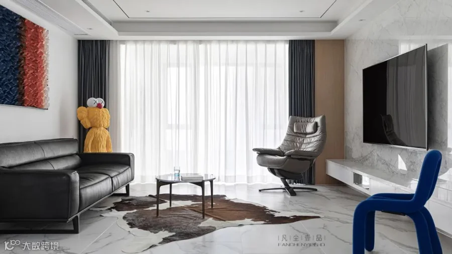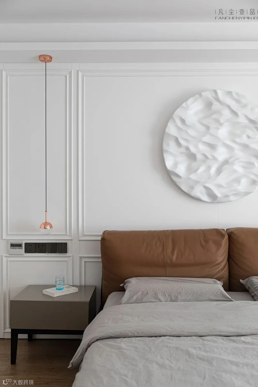 大理石纹作为重要的时尚元素,在摆件与软装中也得到体现,增强了空间的艺术性与个性表达。卧室以浅灰色为主调,搭配简洁家具,营造出温馨舒适的睡眠环境。