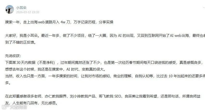 今天,我打算重新阅读这篇文章,从中提取一部分出海相关的干货,希望这些干货能给正在出海的你找到方向、带来力量。然而,由于版权问题,我的以下内容无法给你呈现这位圈友的完整复盘,无法让你看到许多细致的案例,更无法让你感受到这位圈友真诚的分享。