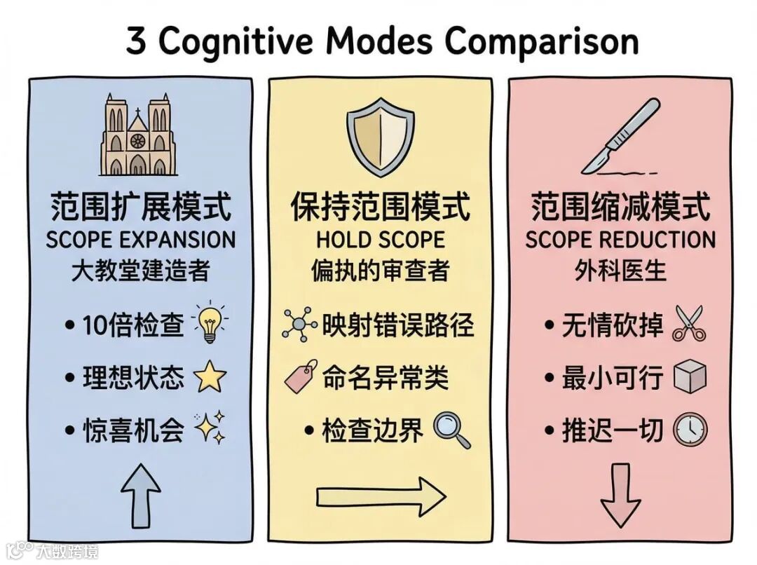 一旦选定模式,即完全承诺。若选扩展,则不得在后续讨论中质疑范围;若选缩减,则不得暗中加回功能。该设计直击当前 AI 助手的核心缺陷:缺乏对用户当前所需认知模式的显式识别与锁定。