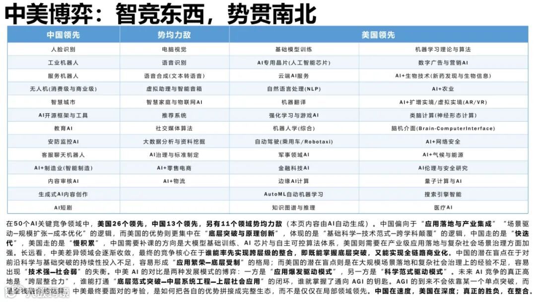 报告指出:中国需补强方向为大模型基础训练、AI芯片与自主可控算法体系;美国则需提升产业级应用落地能力与复杂社会场景治理水平。未来竞争核心在于跨层级整合能力——既掌握底层突破,又实现全链路商业化。