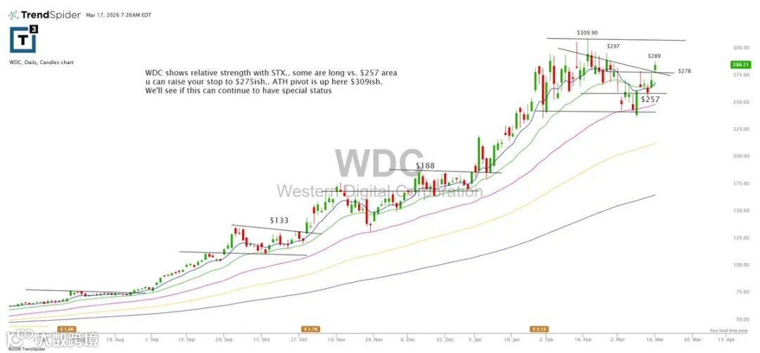 WDC与STX同属存储板块中相对强势标的。部分资金于257附近介入,当前可将止损上移至275。历史高点枢轴在309,能否延续强势值得持续观察。