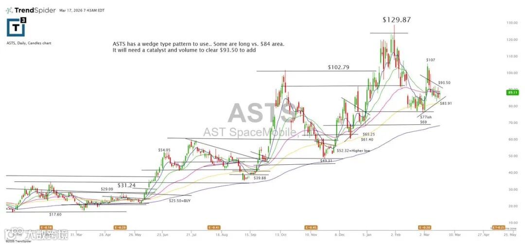 ASTS正构筑楔形整理形态。已有资金于84美元附近介入,若要加仓,需待放量突破93.50并确认有效站稳。