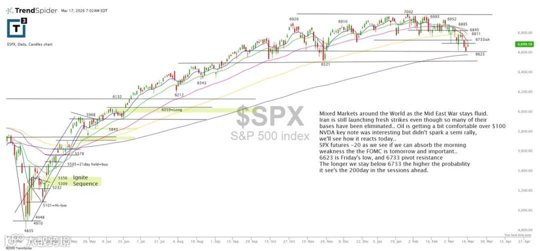 全球市场走势分化,中东局势持续紧张,伊朗近期再度发动袭击,虽多处基地被毁,但地缘风险未减。油价维持在100美元/桶上方。NVDA仍是关键标的,但尚未带动大盘强势反弹。SPX期货目前下跌约20点,需观察能否吸收早盘弱势。技术面上,6623为日线低点,6733为关键枢轴阻力;若持续承压于该位下方,短期下探200日均线概率上升。