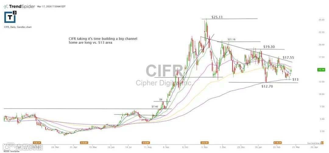 CIFR正在构建较大周期通道,部分资金于13美元附近布局。