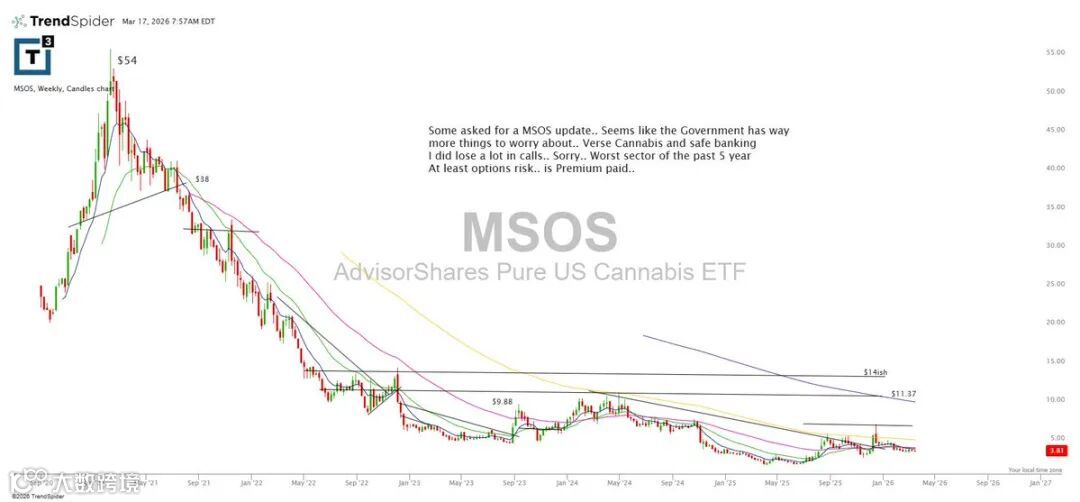 大麻ETF MSOS表现持续疲弱。政策面仍待突破,如联邦层面合法化及安全银行法案进展。该板块为过去五年表现最差领域之一,期权权利金已付,下行风险有限。