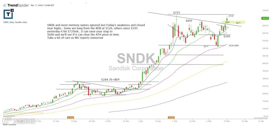 SNDK无视上周五市场弱势,接近年度高点收盘。526 RDR及595均为前期多头介入区域,股价已触及720附近。建议将止损上调至680,并关注是否能有效突破历史高点枢轴。MU财报将于明日公布,或将影响存储板块情绪。