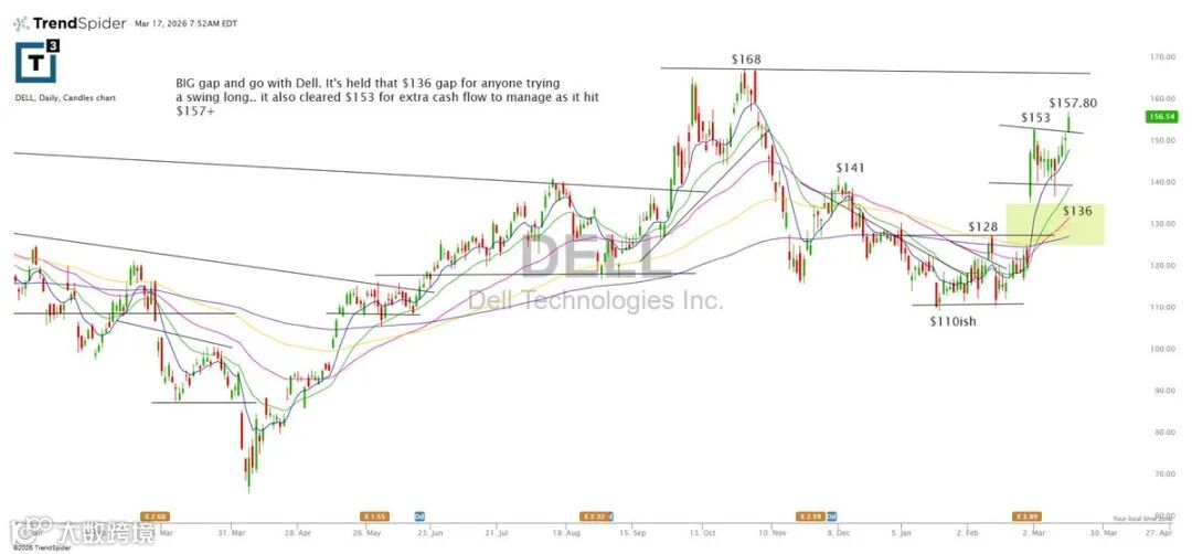 戴尔呈现典型跳空上涨延续形态。波段交易者可关注136美元跳空缺口支撑,以及153美元突破有效性;股价升至157+后,可利用浮盈优化仓位管理。