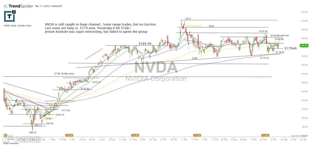 NVDA仍在大级别通道内运行,当前以区间交易为主。资金曾在179附近布局,昨日最高触及188。黄仁勋主题演讲虽具看点,但未能激活整个AI板块。