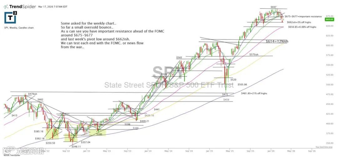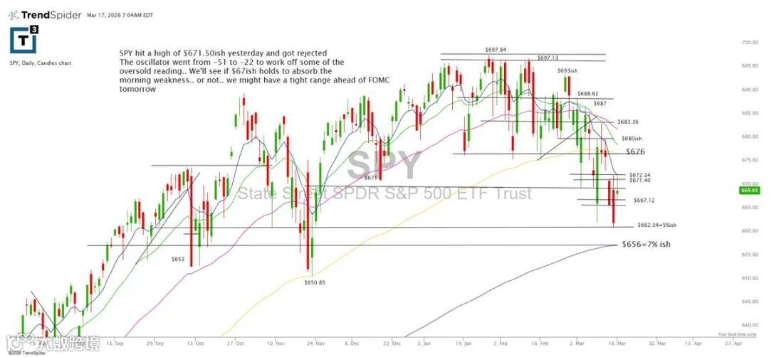 SPY昨日冲高至671.50后回落,振荡指标由-51回升至-22,部分缓解超卖状态。短线关注667能否有效承接早盘压力;若失守,或将在FOMC会议前进入窄幅震荡区间。