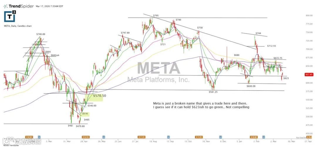 META技术结构已遭破坏,仅存零星交易机会。能否在623附近企稳并重拾升势,是判断其恢复强度的关键。