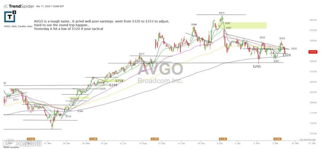 AVGO结构复杂,财报后自320上涨至353完成技术性修复,但暂未形成明确趋势行情。短线交易者可关注320支撑,该位置为昨日最低点。