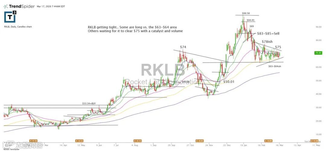 RKLB处于收敛整理阶段。部分资金在63–64美元区域建仓;另一些则等待放量突破75美元后再行动。