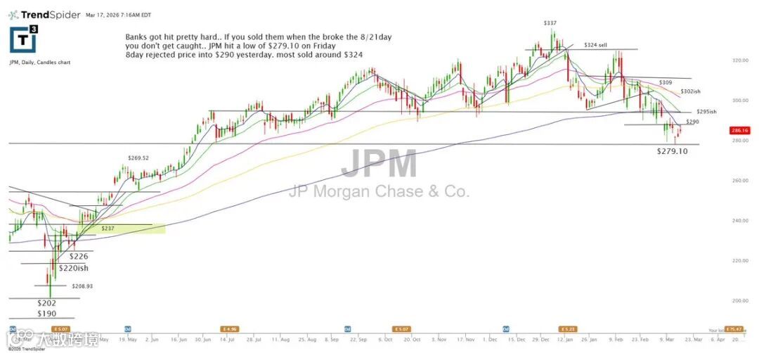 银行股近期跌幅显著。若能在跌破8/21日均线时及时止盈,可规避大幅回撤。JPM上周五低见279.10,昨日反弹受阻于290附近的8日均线,多数投资者已在324区域完成获利了结。