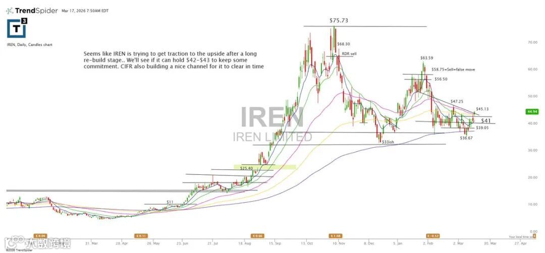 IREN经历长期结构重建后,正尝试重获上行动能。关键观察点为42–43美元支撑区能否守住,以维持资金参与度。