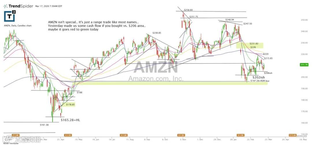 AMZN延续区间震荡特征,无显著方向信号。若于206附近布局,昨日已可获得一定现金流收益。今日或有弱转强迹象,需进一步验证。