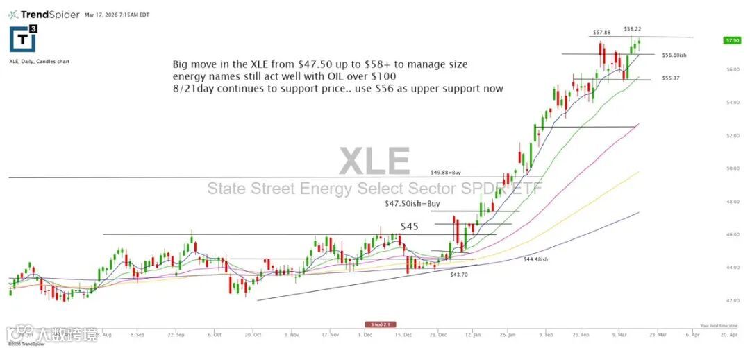 XLE自47.50大幅拉升至58美元以上,建议适时管理仓位。只要油价稳守100美元上方,能源股整体仍具支撑。8/21日均线持续提供托底作用,当前可将56美元视为新近上方支撑参考位。