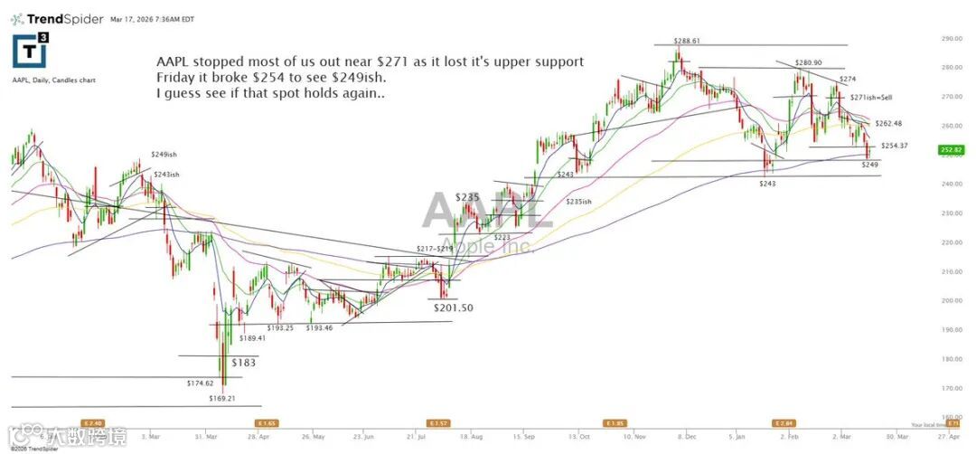 AAPL在271美元附近触发大量止损,周五跌破254,最低探至249。后续需观察该区域能否再度构成有效支撑。