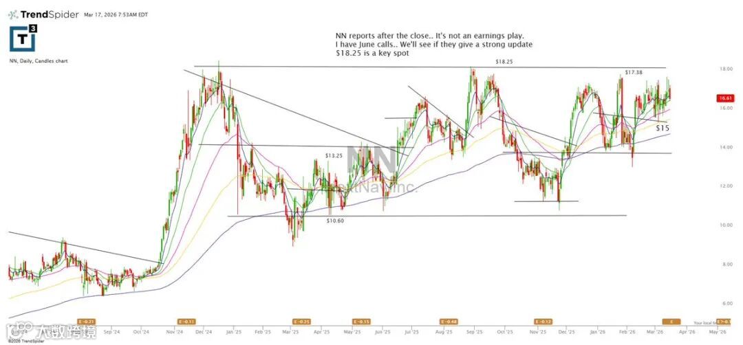 NN盘后公布财报,非纯事件驱动交易。当前持有6月看涨期权,重点关注管理层是否给出积极指引。18.25美元为关键价格位。