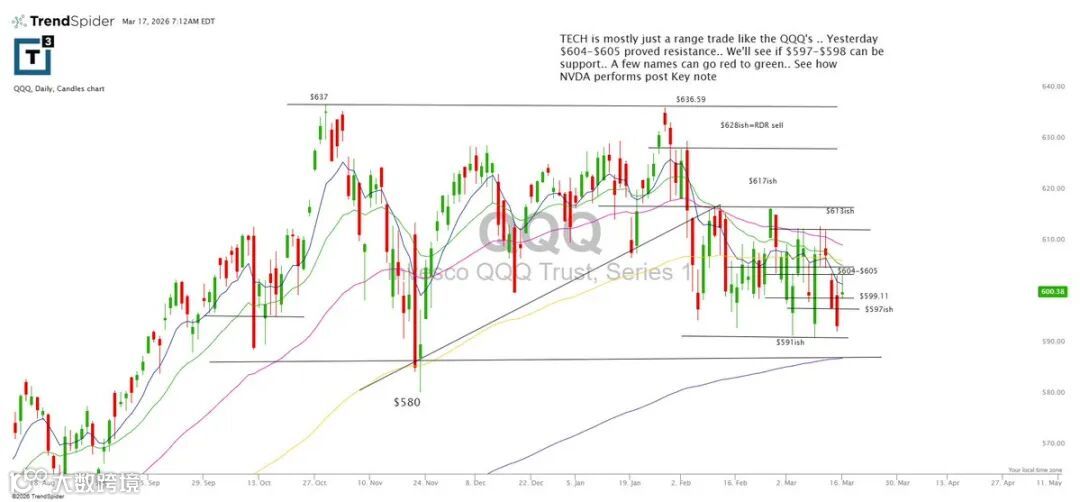 科技股整体处于区间震荡格局,QQQ亦不例外。昨日604–605为明显阻力,下一支撑位关注597–598。个股结构性分化延续,NVDA走势仍是板块风向标。