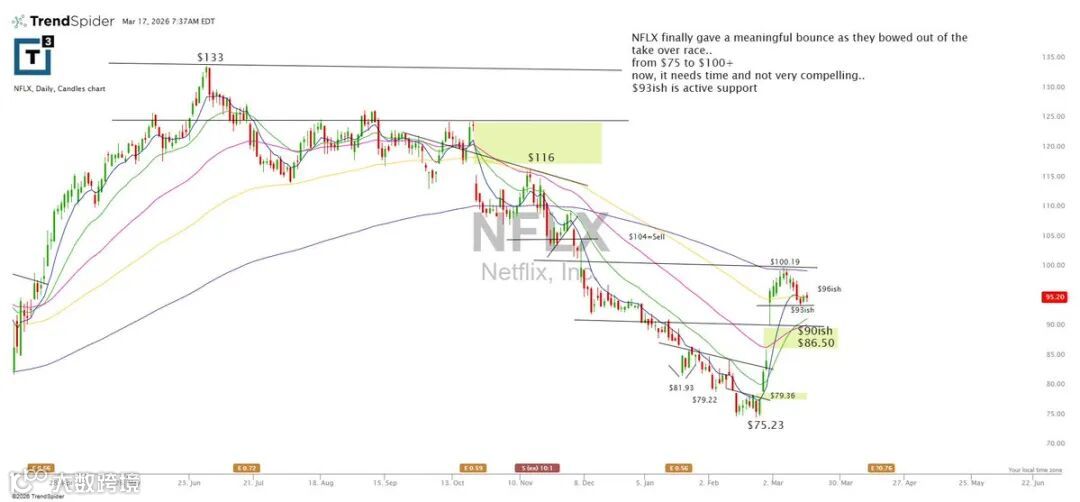NFLX脱离危险区域后出现阶段性反弹,由75升至100以上。当前需时间消化涨幅,结构吸引力有限。93美元为当前关键支撑位。