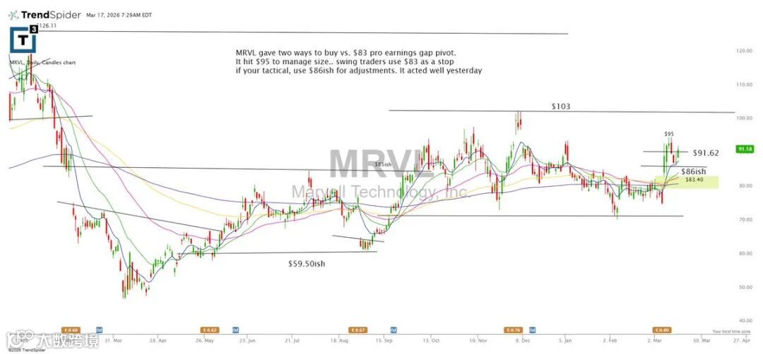 MRVL提供两种操作思路,均围绕83美元财报缺口枢轴:若触及95美元可分批减仓;波段交易者以83为动态止损;短线交易者可参考86美元作为调整基准。昨日走势稳健。