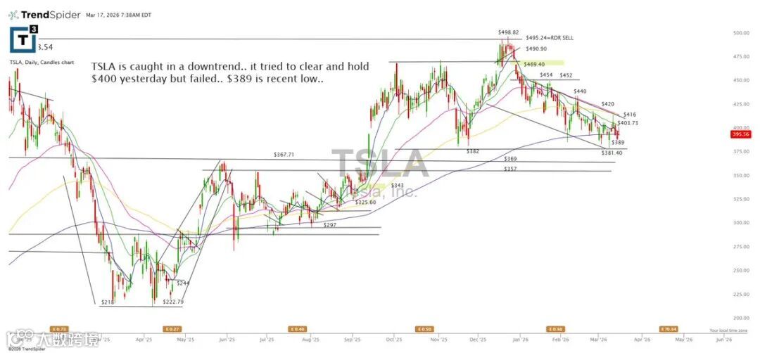 TSLA仍处于下行趋势。昨日尝试站稳400美元失败,短线关注389美元近期低点支撑有效性。