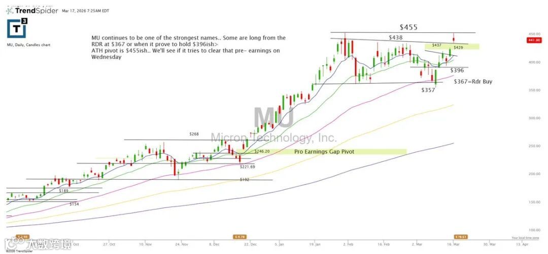 MU持续展现强势,部分资金于367的RDR区域建仓,股价成功守住396支撑。历史高点枢轴位于455附近,财报发布前有望尝试突破。