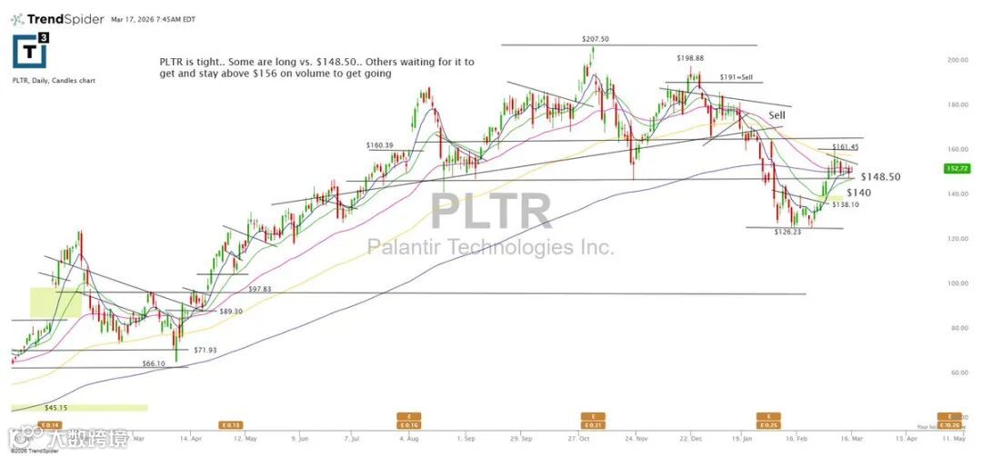 PLTR同样处于缩量整理。部分资金于148.50介入,若想启动主升浪,需放量且连续站稳156美元之上。