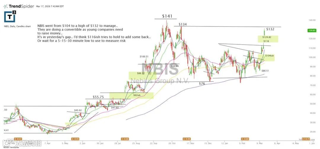 NBIS自104美元涨至132美元高位,建议加强仓位管理。公司正推进可转债融资,当前处于昨日跳空区间内。若116美元支撑有效,可考虑分批回补;或以5–15–30分钟图低点作为风控参考。