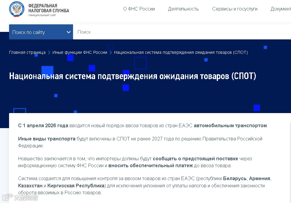 自2026年4月1日起,所有经公路从EAEU国家进入俄罗斯的货物,须提前在СПОТ系统完成申报。进口商须在车辆预计入境日期至少2个工作日前,向俄罗斯联邦税务局提交预供货文件(ДОПП)。