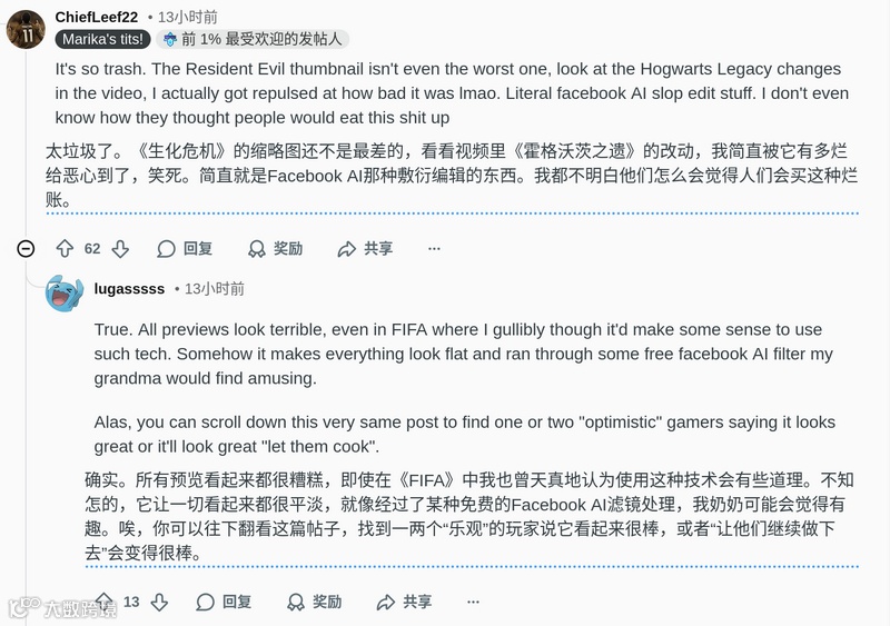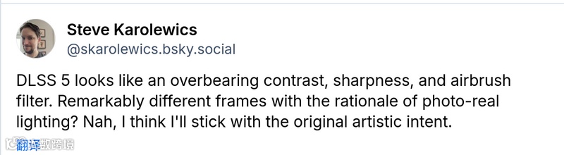 批评不只来自普通玩家,也来自行业内部。Respawn的渲染工程师Steve Karolewics直言:"DLSS 5看起来像是一个过度的对比度、锐化和磨皮滤镜的叠加,与其宣称的'真实光照'相差甚远。"